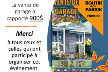 La vente de garage de la Boutik de la Fabrik a rapporté la fabuleuse somme de 900$ – Un grand merci à tous ceux et celles qui ont participé à organiser cet événement et qui en ont fait un succès.